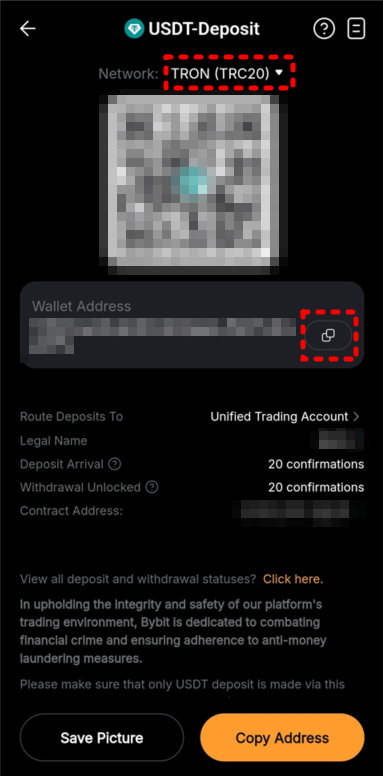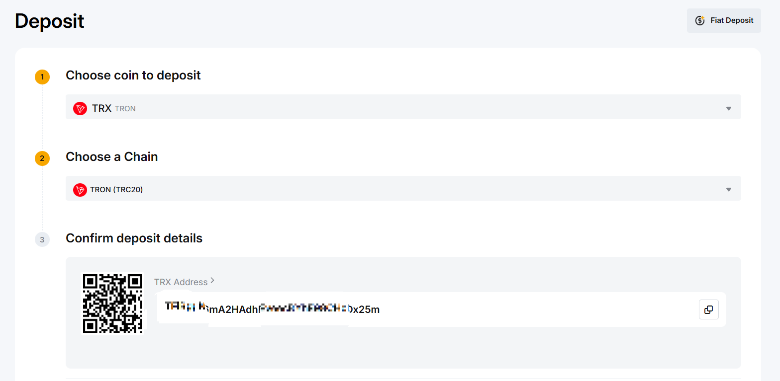 - 네트워크를 TRON(TRC20)으로 지정하면, 입금에 사용할 지갑 주소와 태그(메모)가 표시됩니다.