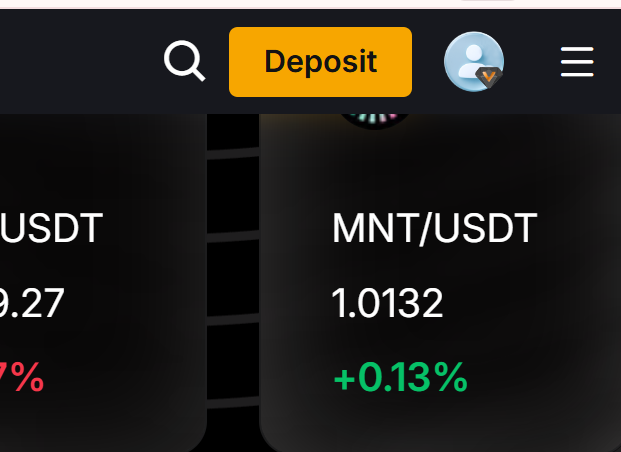 - 모바일 앱 실행 후 상단 메뉴에서 Deposit(입금) → Crypto → USDT를 선택합니다.
