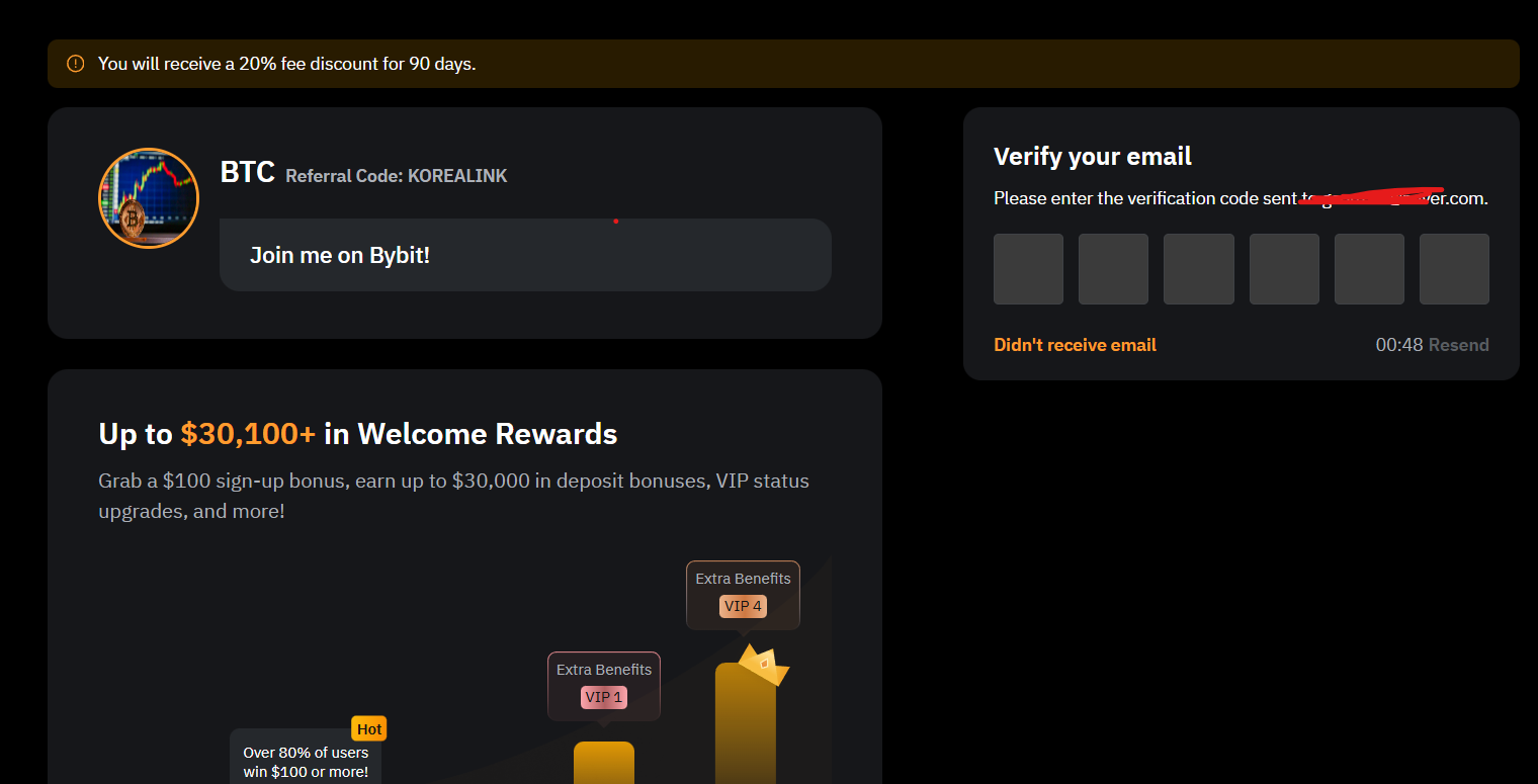 바이비트에서는 이러한 수수료 부담을 줄일 수 있는 방법도 제공하고 있는데, 바로 수수료 할인 코드(레퍼럴 코드)를 통해 가입하는 방식입니다. 할인 코드를 적용해 가입하면 기본 수수료보다 낮은 조건으로 거래가 가능해, 선물거래를 자주 하는 분들에게 특히 유리합니다.
