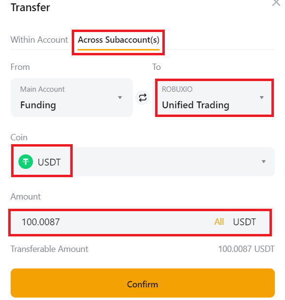 다만, 이 상태에서는 바로 거래를 할 수 없기 때문에 Funding 계정에 있는 자금을 Unified Trading 계정으로 이동해야 현물 또는 선물 거래가 가능합니다. Transfer에 들어가면 윗 사진과 같이 자금을 옮길수 있습니다