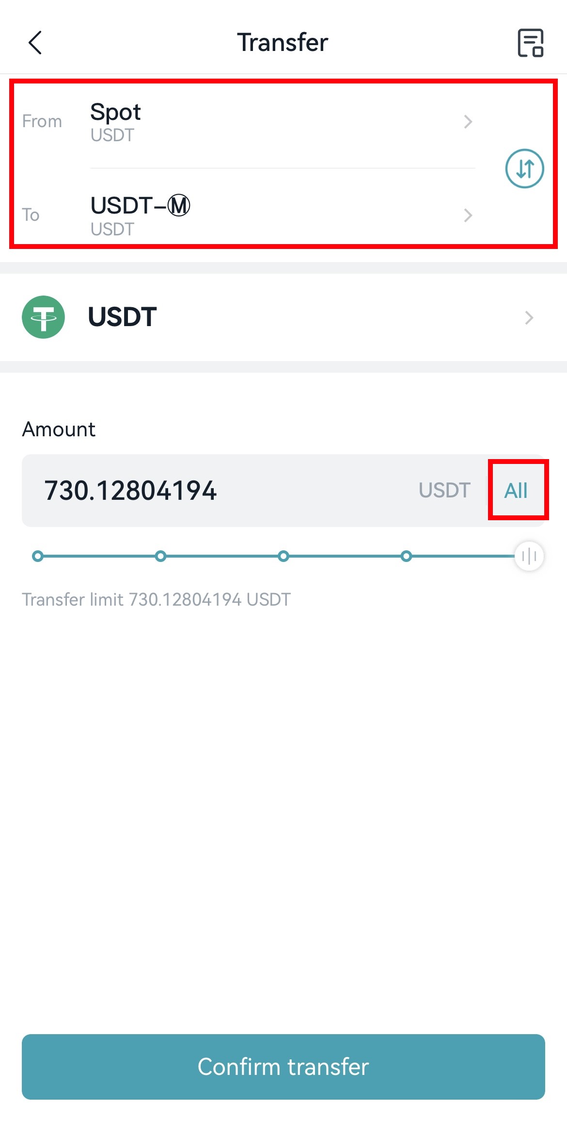 마지막으로 수량 설정 후 최종 확인을 클릭하면 선물지갑으로 코인이 이체되며 원하시는 종목을 선택후 선물거래를 진행하시면 되겠습니다.