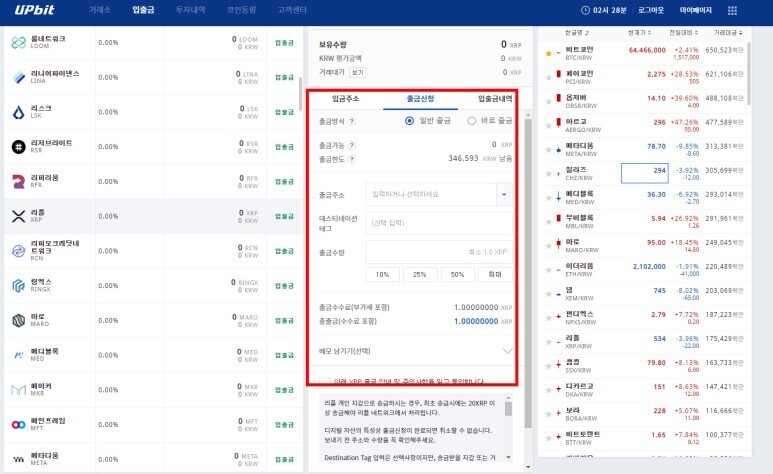 업비트 거래소에서 리플을 구매후 전송할 리플 수량을 입력하신 후 출금주소와 데스티네이션 태그에는 아까 전 비트겟 거래소에서 확인한 리플 지갑의 주소와 Tag 번호를 각각 복사 후 붙여넣기 하시면 되겠습니다.