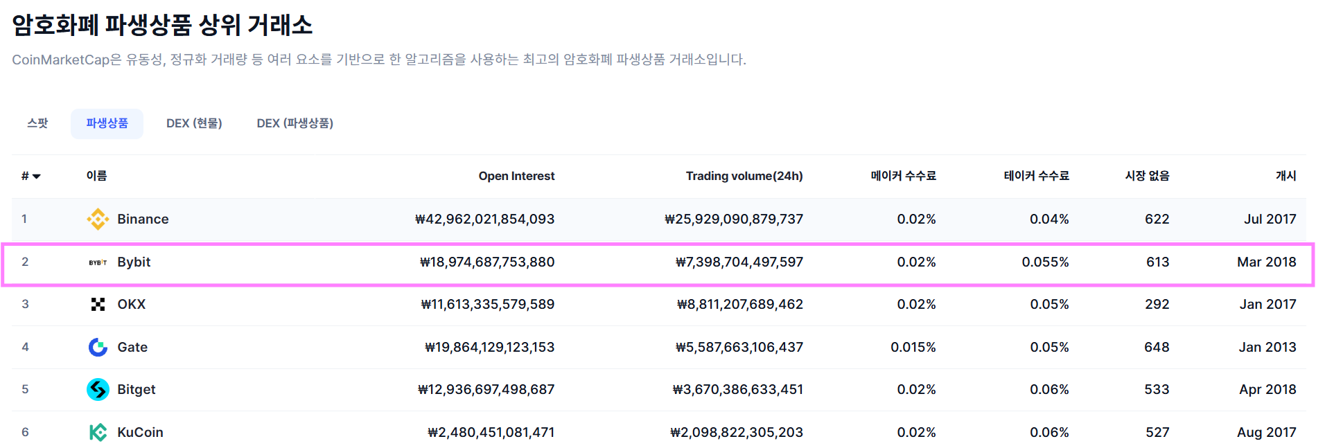 바이비트(Bybit)는 현재 선물 거래소 기준 글로벌 2위에 해당되어 있습니다. 이는 코인마켓캡 사이트뿐만 아니라, 대부분의 암호화폐 거래소 커뮤니티 및 정보 사이트에서도 공통적으로 언급되고 있는 내용이며, 현재 바이낸스, 바이비트, OKX가 글로벌 TOP3 선물 거래소로 선정되어 있습니다.